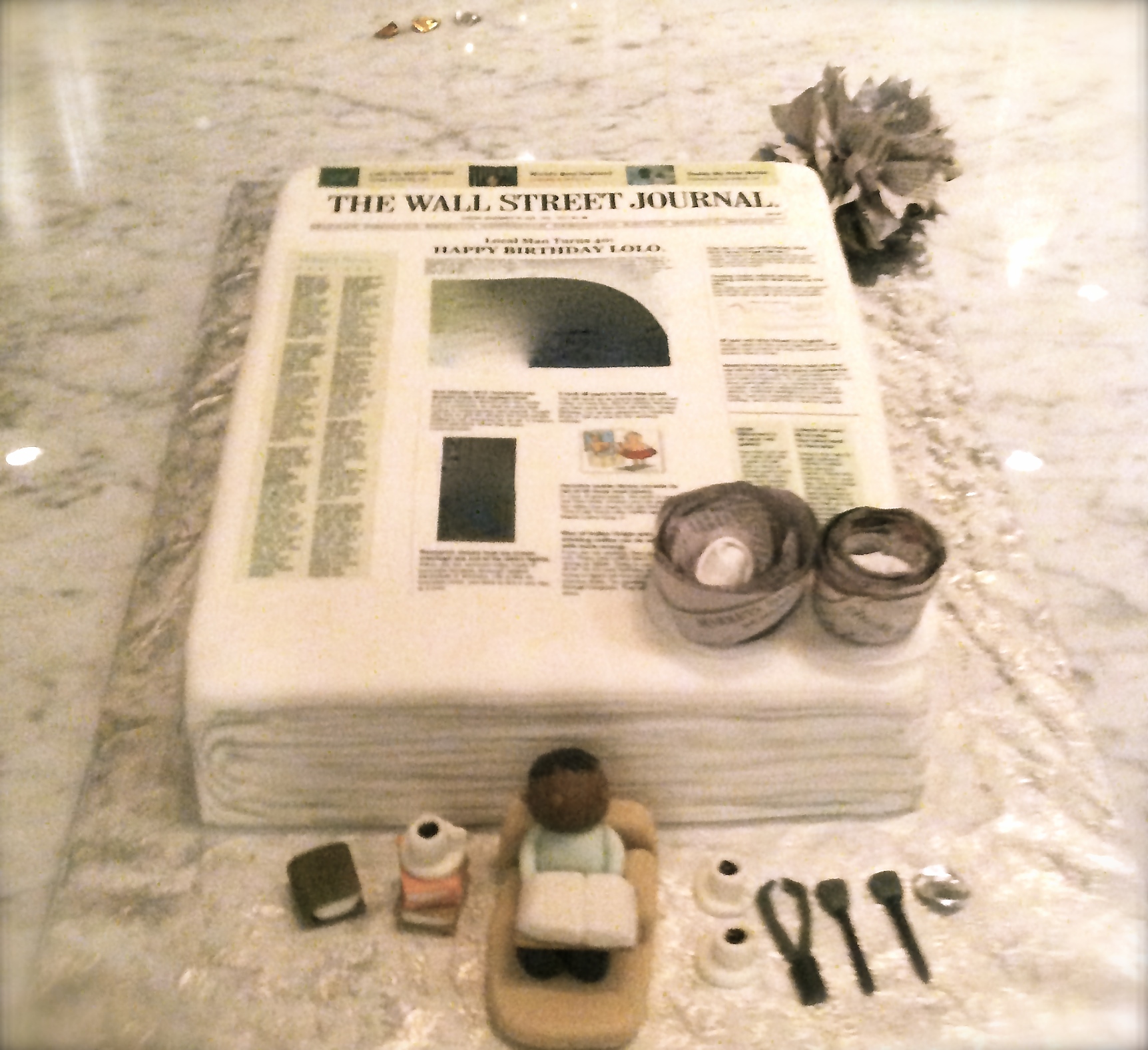 I made these pom poms for my friends 40th birthday. His love for the wall street journal inspired his wife to make a WSJ cake and needless to say I jumped on the idea. She had tons of newspaper and we used it to make pom poms, giant paper flowers, streamers etc. It was not the easiest thing cause newspaper, as supposed to tissue paper, has sharp edges so had to be careful but the outcome was fabulous. I used black silk ribbons to tie and suspended it from the vault and the lights from the backdrop set the mood perfectly.