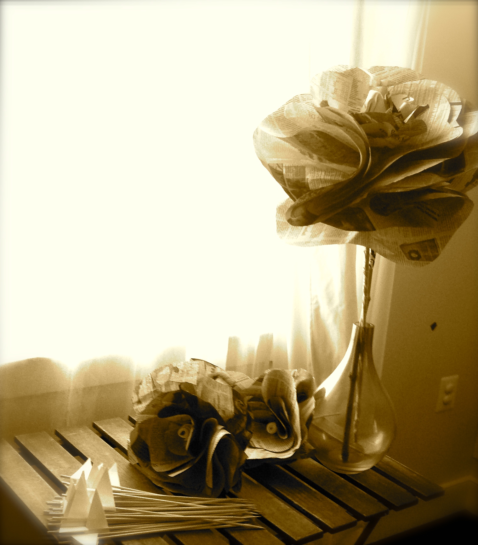I absolutely love these giant newspaper flowers and believe me when I say that these photographs don’t do justice to how gorgeous they really were. We placed them in bunches around the loft in “strategic” locations. It was subtle because of the material so I made them huge so they would stand out. This idea was inspired by my good friend and incredibly talented Brittany Watson and her giant paper flower wedding, which she made herself, check out her blog here. This is the most fun I have had with newspapers of late and we made a bunch of other decorations too, see my next post.
