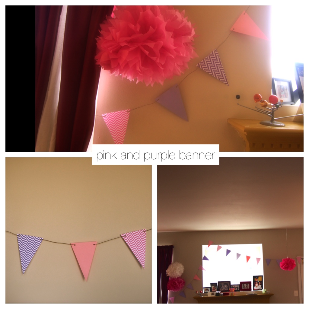 pretty banners for the pretty princess misha! she lives in a very pretty house so it looked great and complimented the gazillion pom poms her mom made for her yay!!!. made with card stock paper, ribbons, twine and did I mention that I crazy glued the back so it won’t move…it used to drive me crazy when that happened – the last thing you want to do when you are putting it up is line them up, make sure they are even etc.